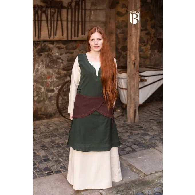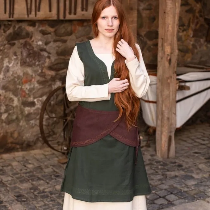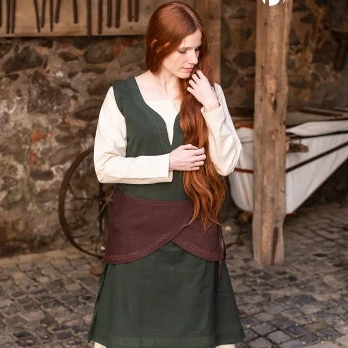 Cette ceinture est fabriquée en coton et peut être portée comme un tablier. Aux extrémités, des cordons pour les tissus vous permettent d’enrouler la ceinture autour de la taille sous forme de tablier. Le fond est richement décoré avec un motif de nœud décoratif en imitation fil d’or. Cette ceinture en tissu confère un attrait supplémentaire à votre tenue de reconstitution ou à votre GN.