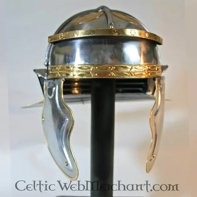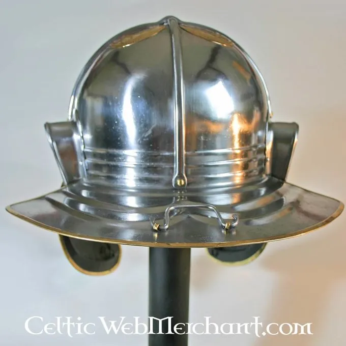 La reproduction est faite d’acier et est orné de laiton décorée. Il est adapté pour une circonférence de la tête jusqu’à 60 cm et est livrée avec un bonnet de coton d’armement.