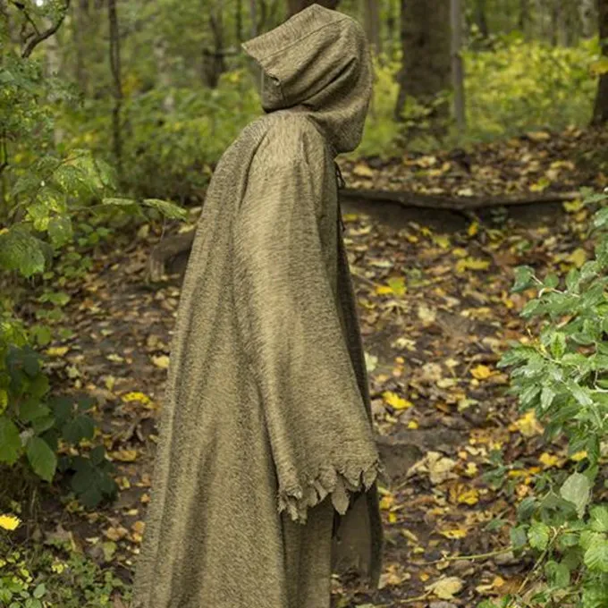 Traditionnellement, les robes étaient portées dans des contextes religieux, par exemple par des moines et des prêtres. Dans la littérature fantastique traditionnelle, cela est devenu le vêtement de personnages magiques. Cette robe est conçue pour paraître usée et effilochée. Il est fait de coton texturé, qui ressemble à un tissu rugueux ressemblant à de la jute et qui est effiloché sur tous les bords. Si vous jouez à un orc, à un troll, à une autre créature monstrueuse ou à un paria, c’est un vêtement parfait à porter par-dessus votre costume. En raison de la finition rugueuse et de la capuche que vous pouvez porter sur la tête, le peignoir vous donne un aspect effrayant et pervers. Cela le rend également très approprié pour Halloween et le théâtre. La cape convient aux vêtements de plein air en toutes saisons et protège de la pluie et du froid. Vous pouvez attacher la robe au cou avec une dentelle en cuir et une bande de cuir.