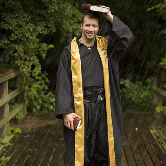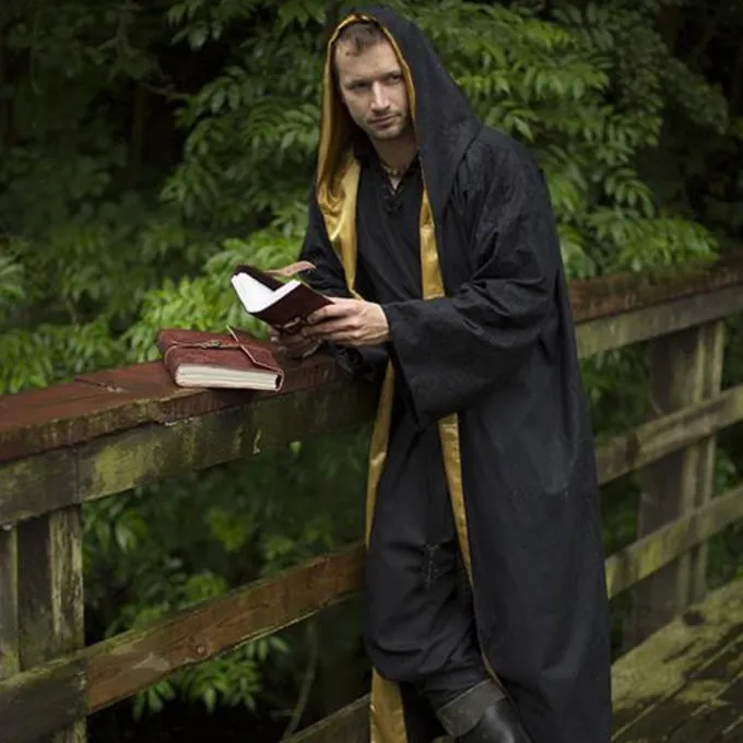 Cette robe est parfaite pour le GN et le cosplay de personnages magiques. La robe a de longues manches larges et une grande capuche. L’intérieur de la capuche et la doublure intérieure sont garnis de satin jaune.