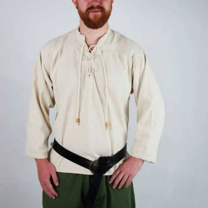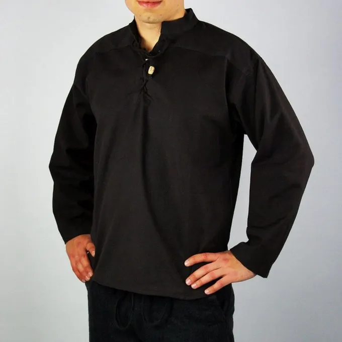 Cette chemise est tissé à la main de coton doux. Le col peut être fermé avec un cordon. Il est disponible dans les couleurs noir, vert, bleu, rouge, crème, brun clair et brun foncé dans les tailles S à XXXL.