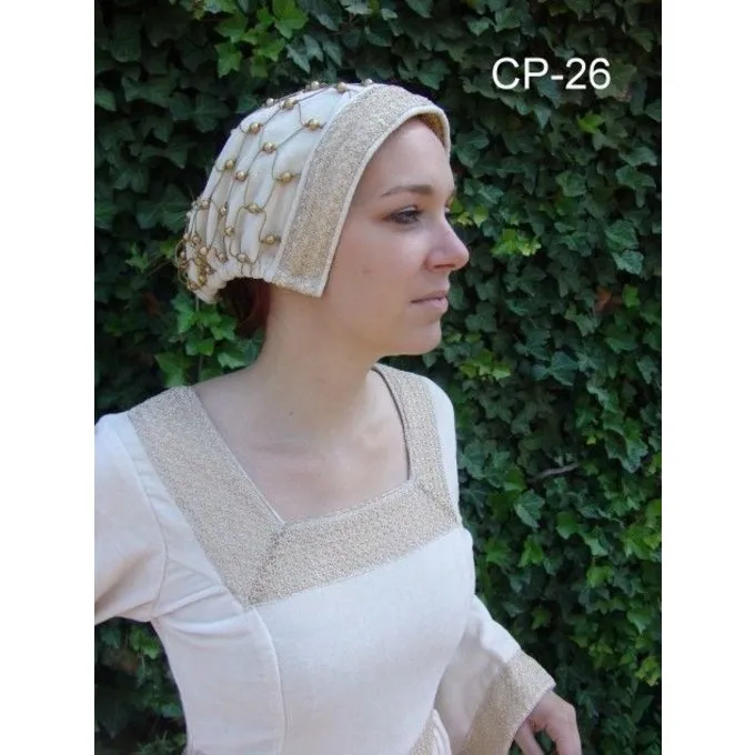 Coiffes de ce genre ont été portés pendant la Renaissance par les dames riches de l’Angleterre, la France, l’Italie, l’Espagne et la Flandre. Ce chapeau est fait de velours et est recouvert d’une résille. Le bord est décoré avec un ruban brodé.