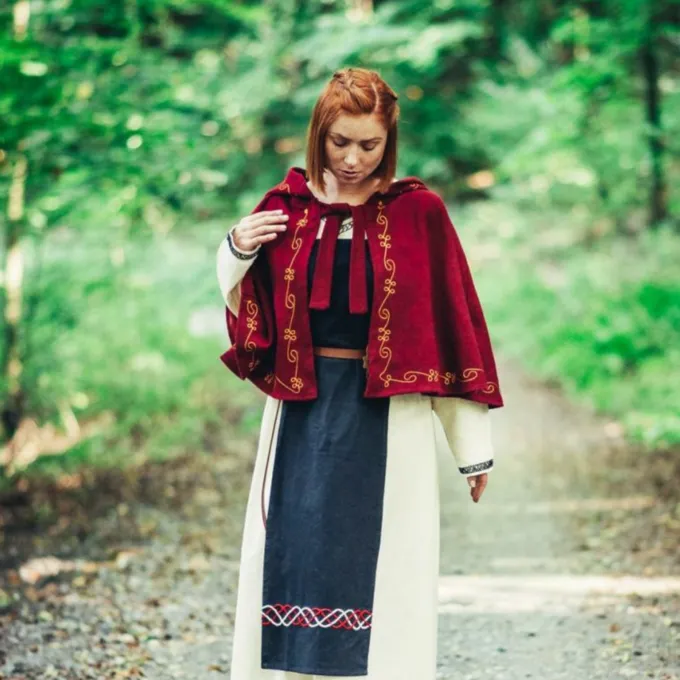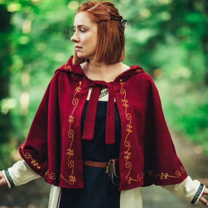 Le chaperon est une coiffe médiévale qui a été principalement porté par les classes inférieures de la société au début du Moyen Age. Vers la fin du Moyen Age, les gens les plus riches ont également commencé à porter chaperons à la mode. Ce luxueux chaperon est faite d’un mélange de laine et protège votre tête, le cou et les épaules contre le vent, la pluie et le froid. Un accessoire agréable pour quand vous serez rejouent ou en hiver GN ou juste un jour froid. Le chaperon est joliment décoré sur les bords avec des motifs brodés de vigne. Vous pouvez fixer le chaperon avec les cordons de laine afin qu’il reste confortablement en place. Il a une capuche longue pointue dans un style médiéval.