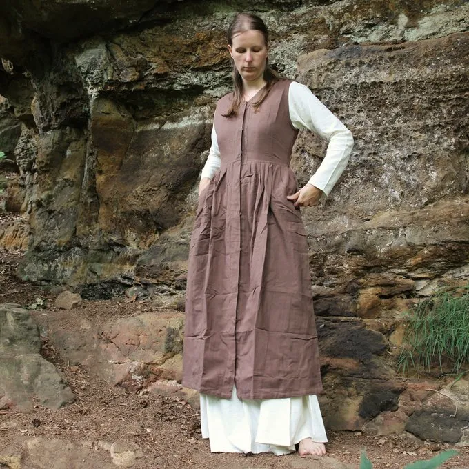 Cette robe sans manches est faite de coton et peut être fermée avec des boutons en bois.