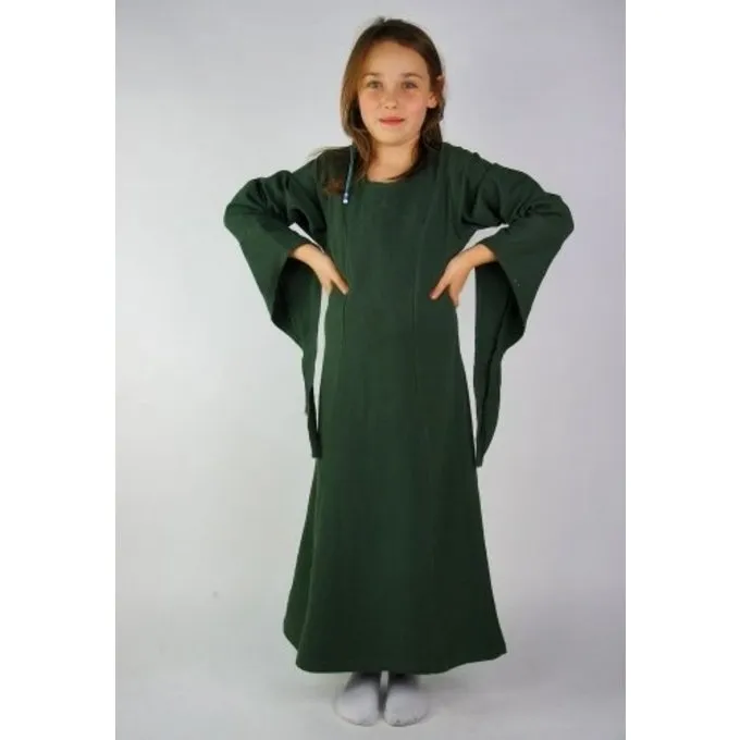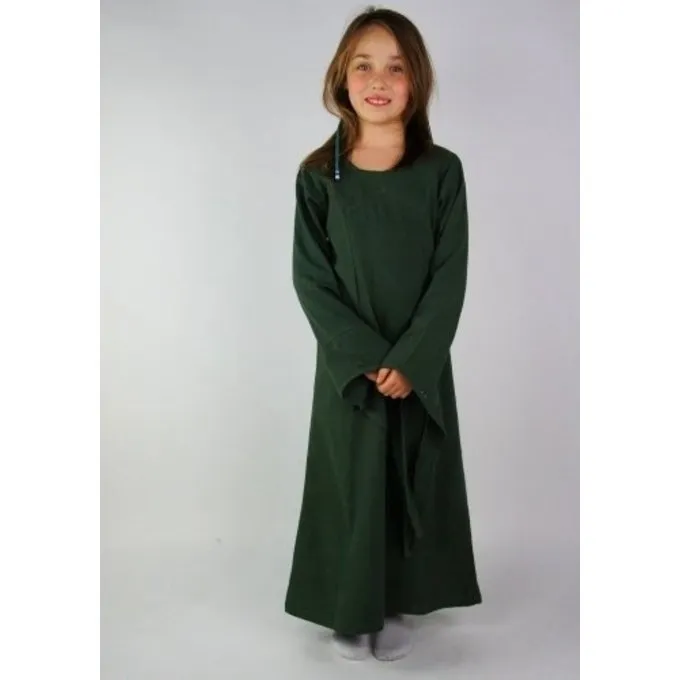 Cette robe est en coton et a des manches fin larges. Il peut être serré avec un cordon à l’arrière et il peut être porté en combinaison avec une ceinture ou un tablier. La robe est disponible en taille XXXS à XS en vert, rouge et crème.