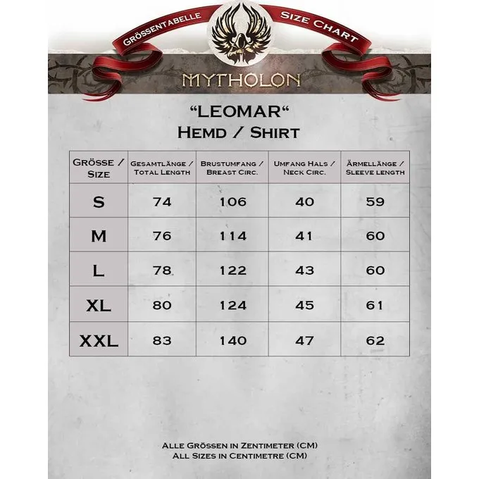La chemise Leomar a un ajustement médiéval classique et est fermée avec un laçage à l’avant. La chemise est en toile, un tissu robuste qui vous durera longtemps. Cette chemise est idéale comme base pour votre costume médiéval pour une réunion de larps ou un festival médiéval.