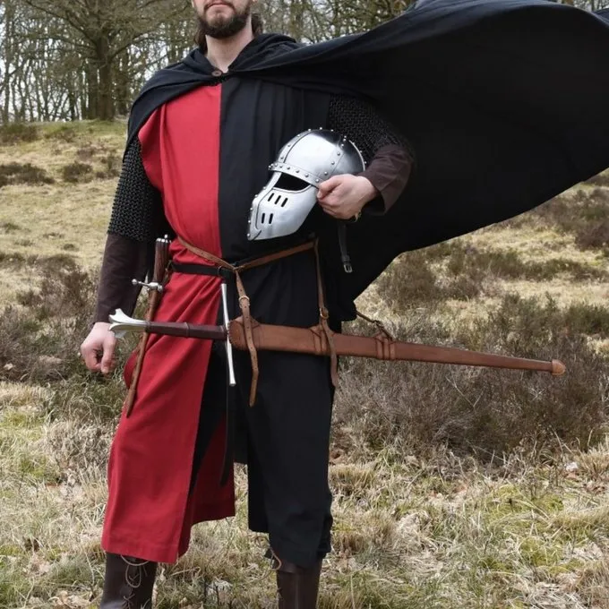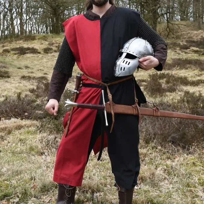 Ce manteau est idéal pour les armures de cotte de mailles et de palte. À l’origine, le manteau avait été mis au point lors de la première croisade, au cours de laquelle les chevaliers étaient exposés à la chaleur et à la poussière énormes pendant de plus longues périodes. La couche protectrice empêchait le métal de devenir trop chaud. Plus tard, ces manteaux ont été utilisés dans toute l’Europe et appartenaient à l’identité du chevalier et de la chevalerie. Le surcoat a également été utilisé dans la bataille pour indiquer différentes parties et familles.